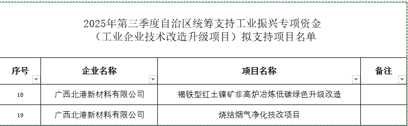 據(jù)顯示,廣西北港新材料有限公司褐鐵型紅土鎳礦非高爐冶煉低碳綠色升級(jí)改造、燒結(jié)煙氣凈化技改項(xiàng)目均入選此名單中。